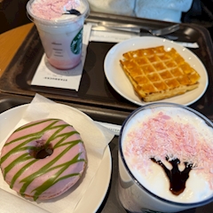 こんばんは のんです 桜〜🌸🌸🌸 桜が大好きで スタバの新作とか全然知らないのに 桜だけはしっかり毎年飲みます🫶 桜ラテ 桜の味が好きすぎる!! ドーナツは 中に入ってる抹茶が 抹茶あん感あって 苦手でした💭 ※あんこ本当に食べれない民